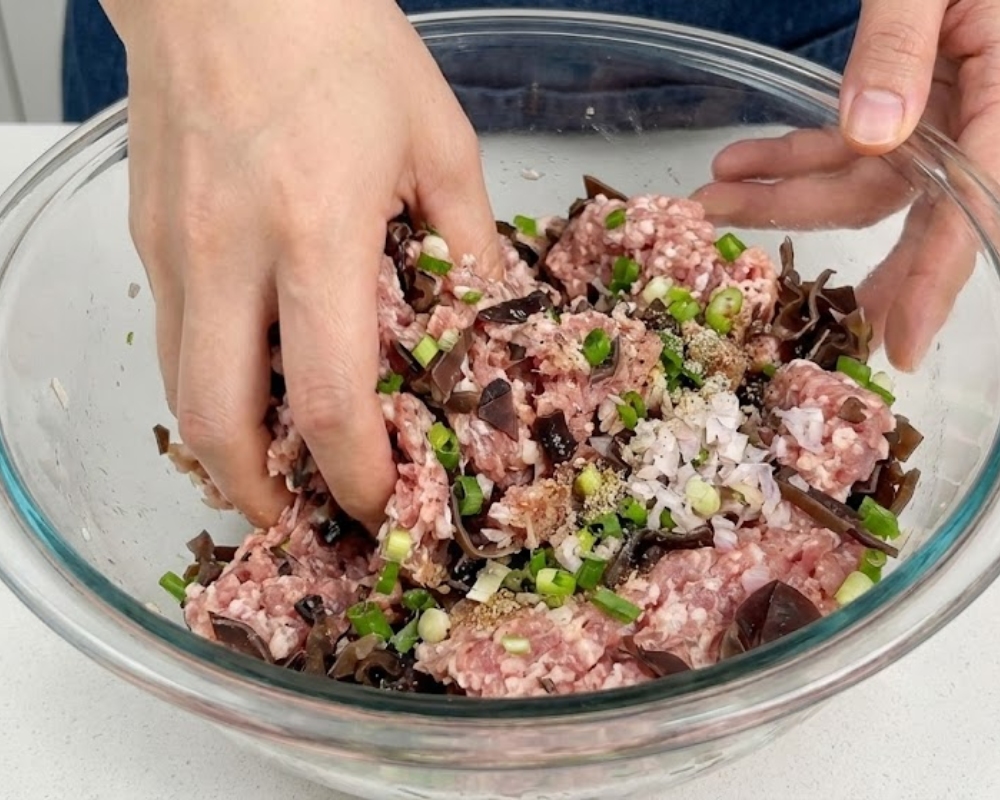 - Cho thịt heo xay vào tô, thêm nấm mèo, hành lá, hành tím, tỏi, nước mắm, muối và tiêu.