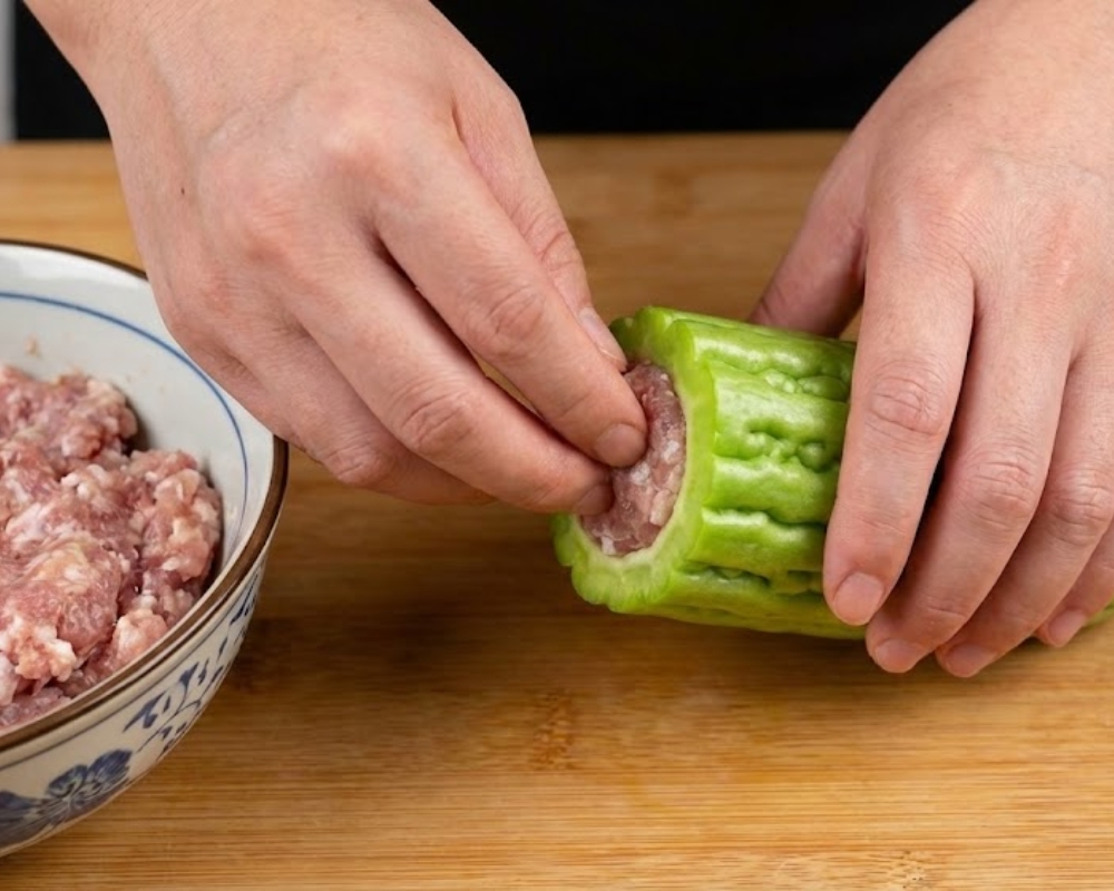 - Nhồi nhân thịt vào từng khúc khổ qua.
