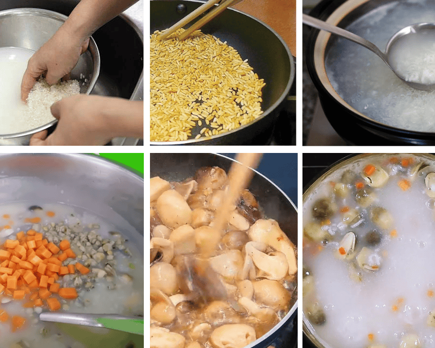 - Cách chế biến: Gạo rang sơ cho dậy mùi, nấu cùng nước hến, nấm và cà rốt để cháo sánh mịn, dậy hương.