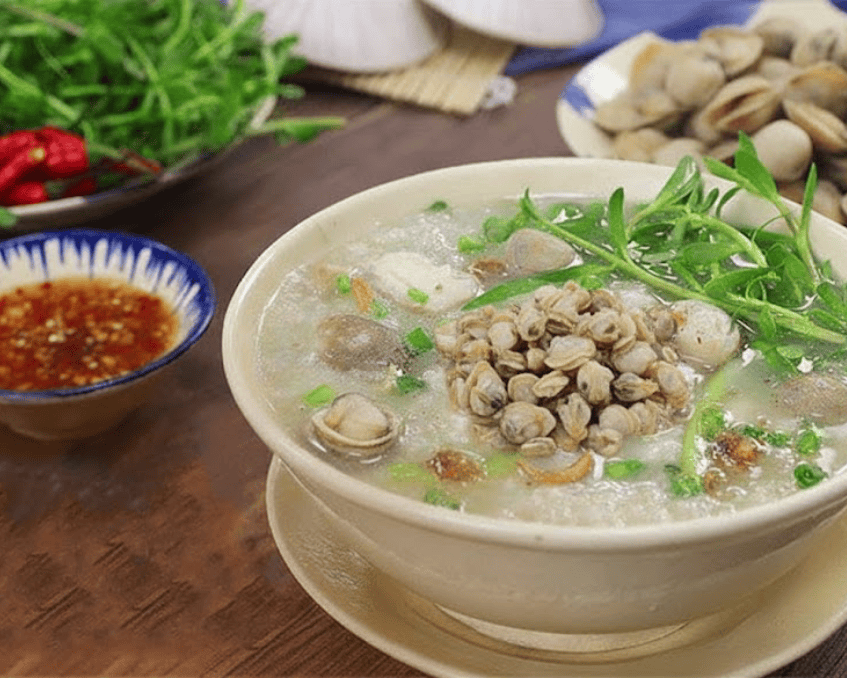 - Hương vị: Cháo hến nấm rau đắng hòa quyện giữa vị ngọt thanh của hến, béo nhẹ từ nấm rơm, và vị đắng đặc trưng thanh mát của rau đắng.
