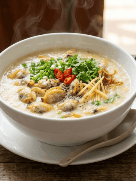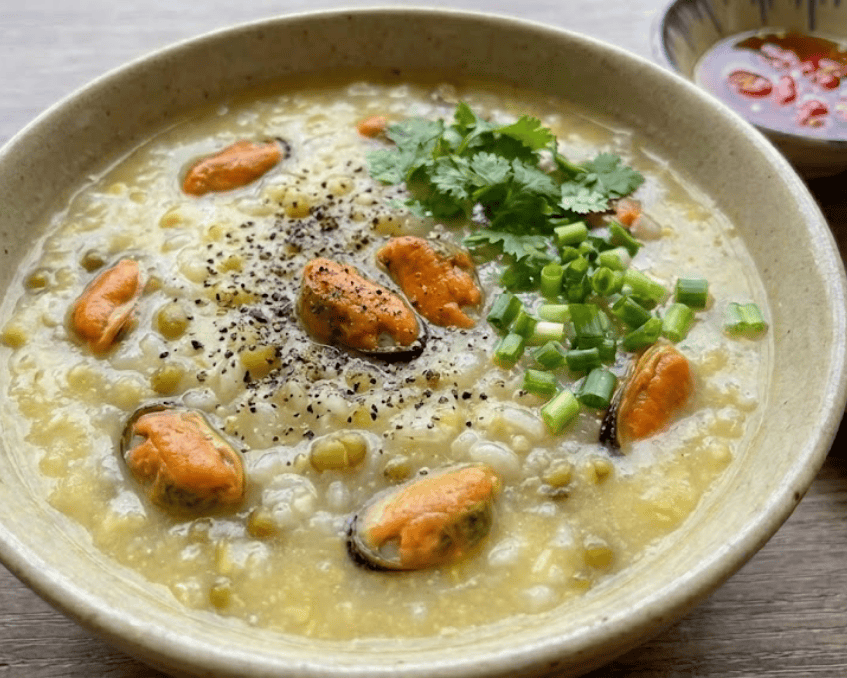 - Cách trình bày và thưởng thức: Tô cháo nóng hổi bốc khói của đậu xanh và những miếng vẹm căng mọng.