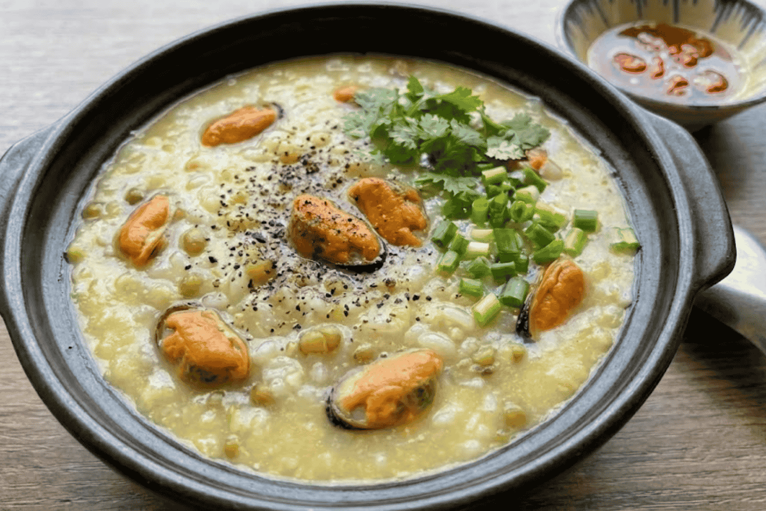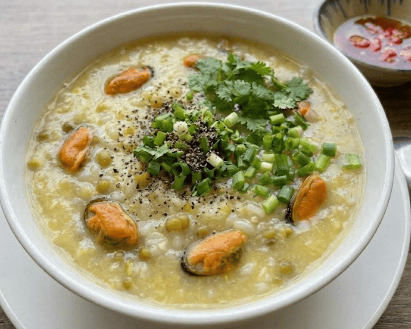 - Hương vị: Cháo có độ sánh mịn, vị ngọt sâu từ nước luộc vẹm. Thịt vẹm xào săn cùng đậu xanh nấu nhừ tạo cảm giác bùi béo tan trong miệng.