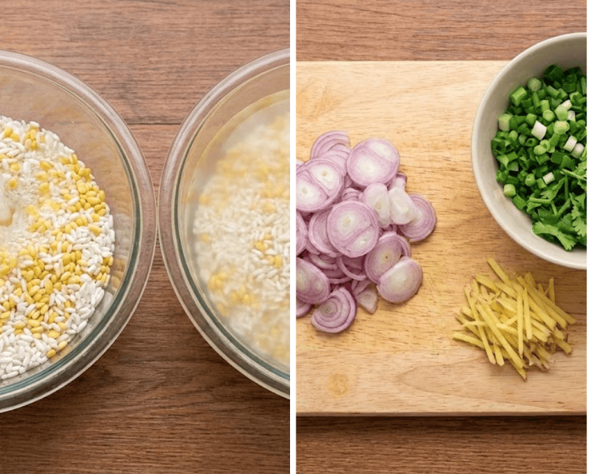 - Trộn gạo tẻ, gạo nếp và đậu xanh lại với nhau. Vo sạch bụi bẩn rồi ngâm với nước ấm trong khoảng 30 phút để gạo và đậu nở mềm, giúp nấu cháo nhanh nhừ hơn.