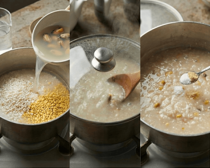 - Cho gạo và đậu xanh đã ngâm vào nồi. Đổ phần nước luộc vẹm đã lọc và thêm nước lọc vào cho đủ lượng nước cần thiết.