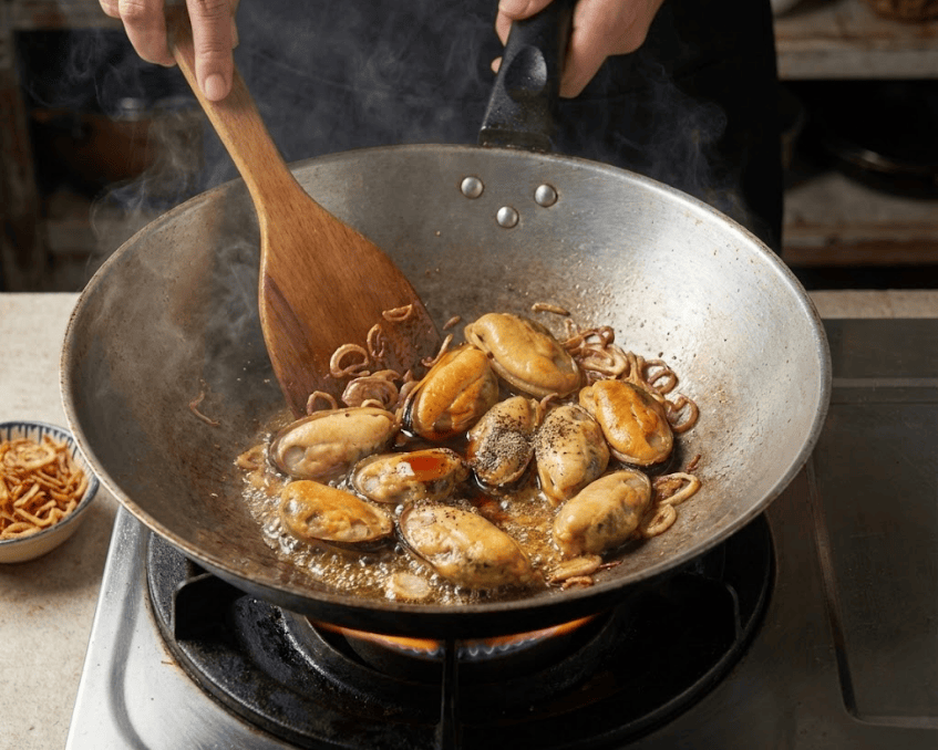 - Nêm nước mắm và một chút tiêu xay vào vẹm. Đảo nhanh tay trên lửa lớn khoảng 2 phút cho thịt vẹm săn lại, ngấm gia vị và hết mùi tanh. Tắt bếp.