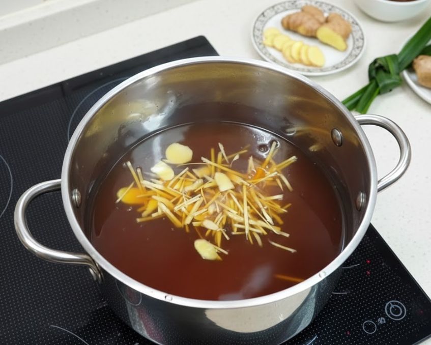 - Đun ở 90–95°C cho đường tan, nước thơm gừng (khoảng 8–10 phút).