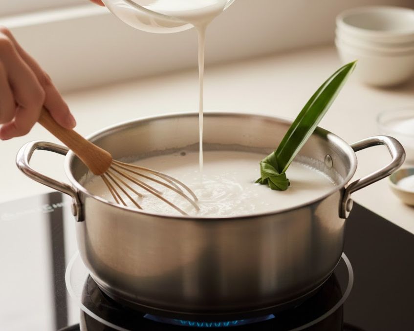- Cho nước cốt dừa + muối + đường vào nồi, đun 80–90°C (lửa nhỏ).