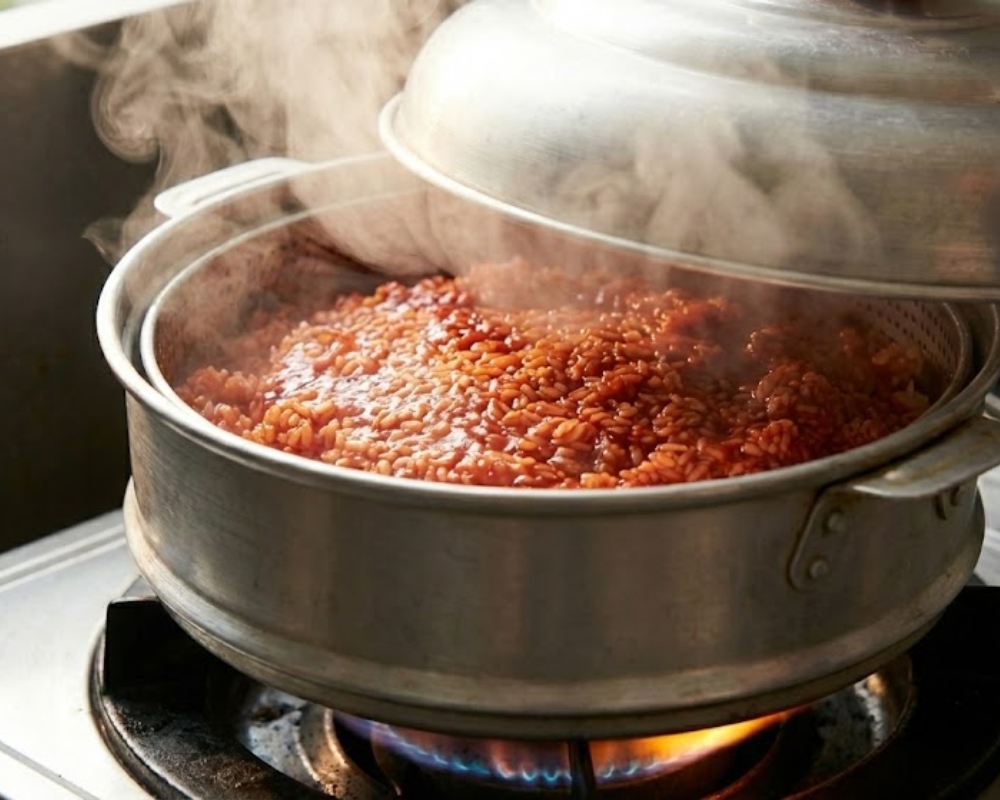 • Cho nếp vào xửng hấp, đồ xôi ở hơi nước sôi ~100°C trong 30–40 phút.