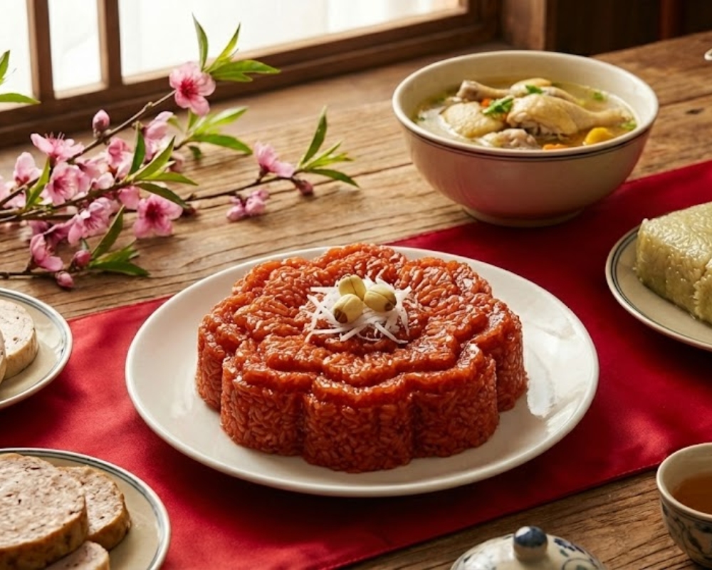 Xôi gấc là món ăn truyền thống quen thuộc trong mâm cỗ ngày Tết của người Việt, đặc biệt phổ biến ở miền Bắc và miền Trung. Món xôi có màu đỏ cam tự nhiên tượng trưng cho may mắn, sung túc đầu năm. Xôi gấc ngon đạt chuẩn khi hạt nếp chín đều, dẻo mềm, không nát, màu đỏ tươi đẹp mắt và hương thơm béo nhẹ của gấc hòa quyện với nước cốt dừa.