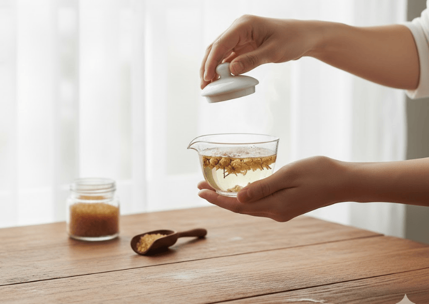 - Đậy nắp và hãm trà trong khoảng 5–7 phút. Bạn sẽ thấy những cánh hoa nở dần và hương thơm lan tỏa.