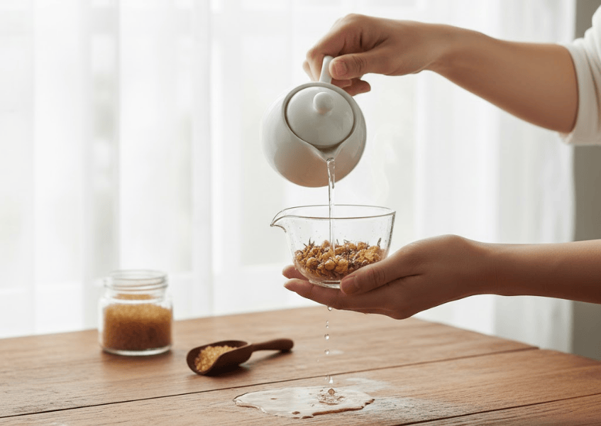 - Đổ một chút nước sôi 90–95 độ C vào tráng qua hoa/trà, sau đó đổ bỏ nước này đi. Bước này giúp loại bỏ bụi bẩn và đánh thức hương thơm của trà.