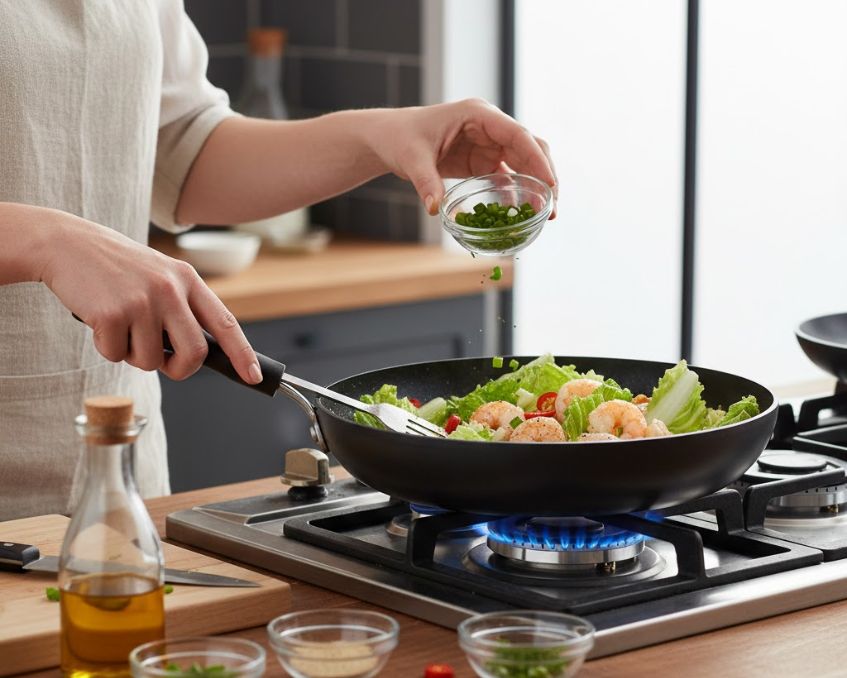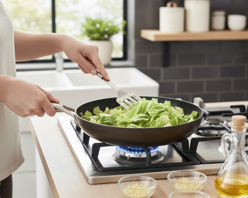 • Cho cải thảo vào xào ở lửa lớn 2–3 phút, nêm muối, dầu hào và nước mắm cho vừa khẩu vị.