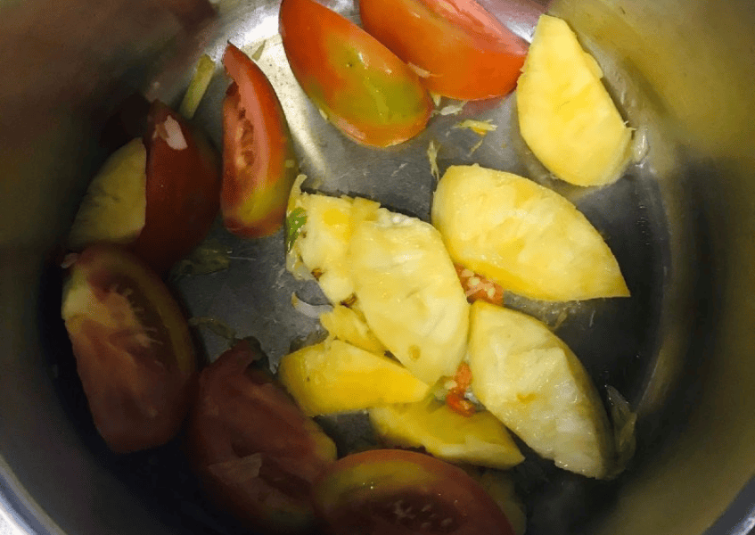 • Cho cà chua vào xào sơ. Đổ nước sạch (1,5 lít) vào đun sôi.