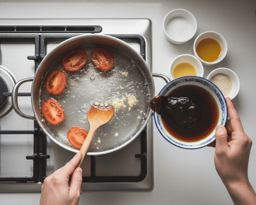 • Phi thơm tỏi với dầu, cho cà chua vào đảo sơ, thêm nước lọc vào nồi. Đun sôi.