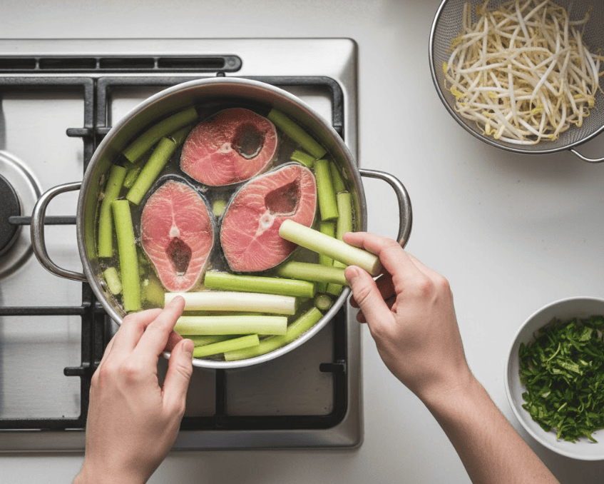 • Cho cá ngừ vào nồi nước dùng, đun lửa vừa khoảng 15 phút.