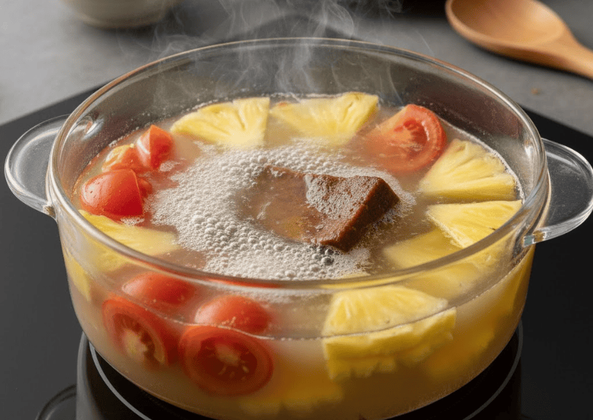 - Cho 1,5 lít nước vào nồi, thêm nước cốt me, cà chua và dứa vào nấu sôi.