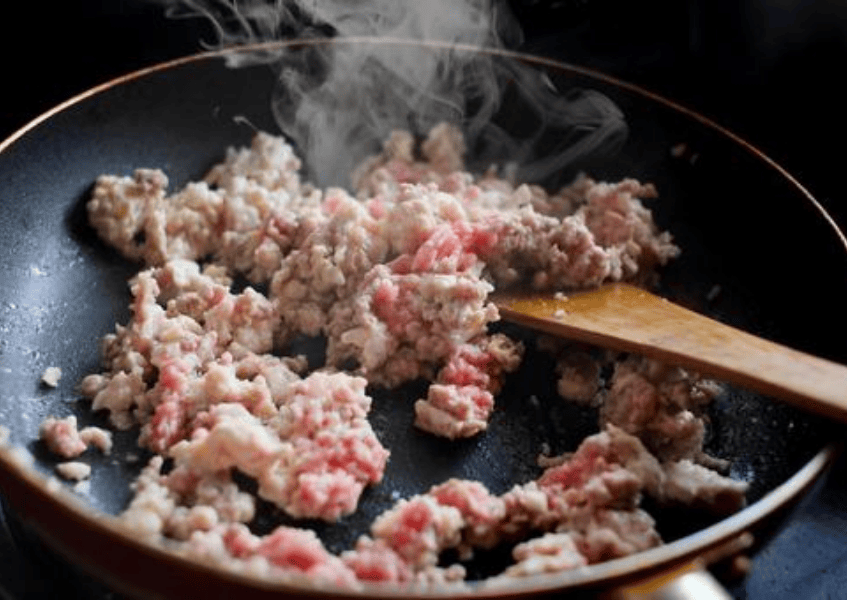 Cho thịt băm vào xào cho săn, dậy mùi thơm, sau đó đổ nước lọc vào.