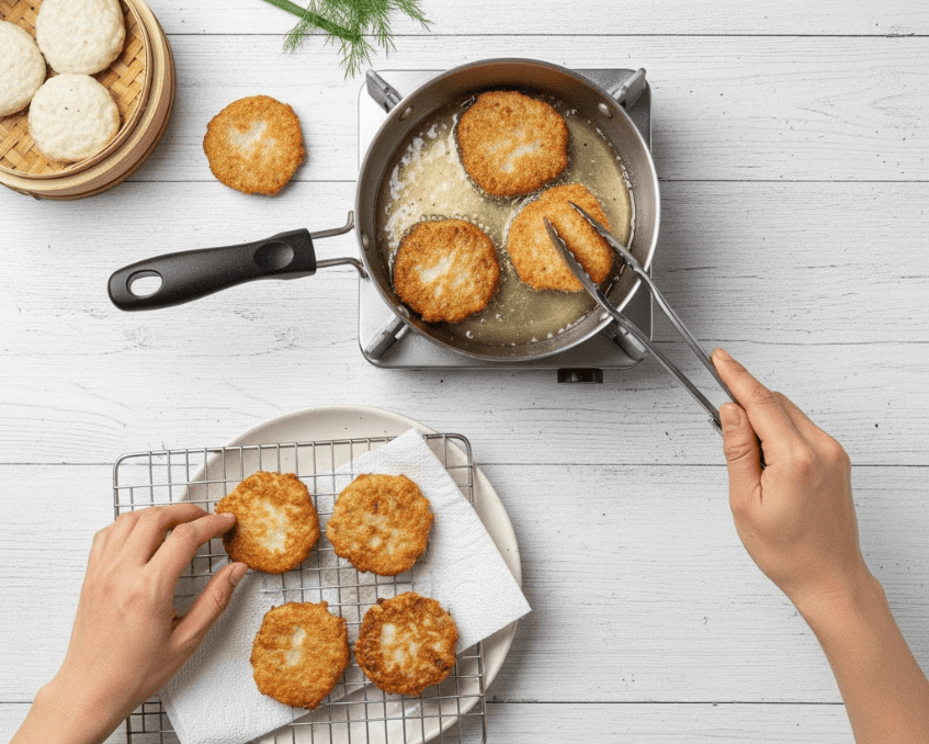 - Làm nóng dầu đến 120 - 150 độ C, chiên từng mẻ đến khi vàng giòn, vớt ra để ráo dầu.