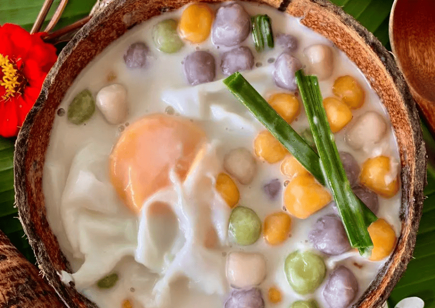 - Cách chế biến: Các loại củ quả được thái hạt lựu, nấu chín riêng hoặc sơ chế trước. Sau đó, tất cả được nấu chung trong nồi nước cốt dừa và nước lọc có pha đường, đun nhỏ lửa để nguyên liệu thấm đều độ béo ngọt.
