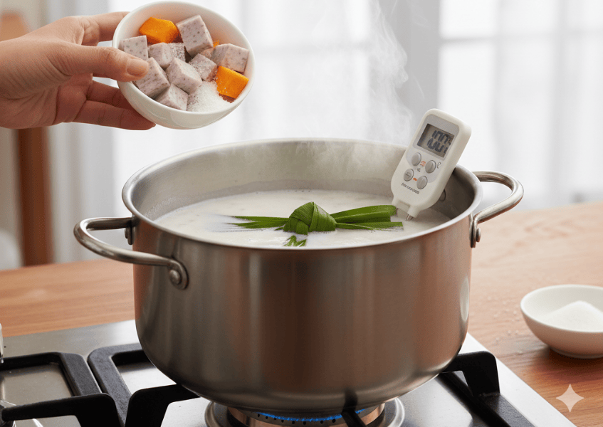 - Đun sôi 600 ml nước lọc và 200 ml nước cốt dừa. Cho đường, lá dứa và 1/4 muỗng cà phê muối vào. Khi nước sôi (100∘C), cho khoai vào nấu lửa nhỏ.