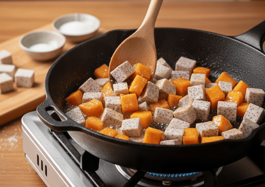 - Khoai củ: Thái hạt lựu. Xào sơ khoai lang, khoai môn với 2 muỗng canh đường để khoai thấm ngọt và không bị nát khi nấu.