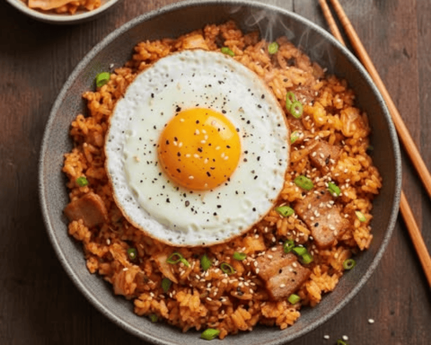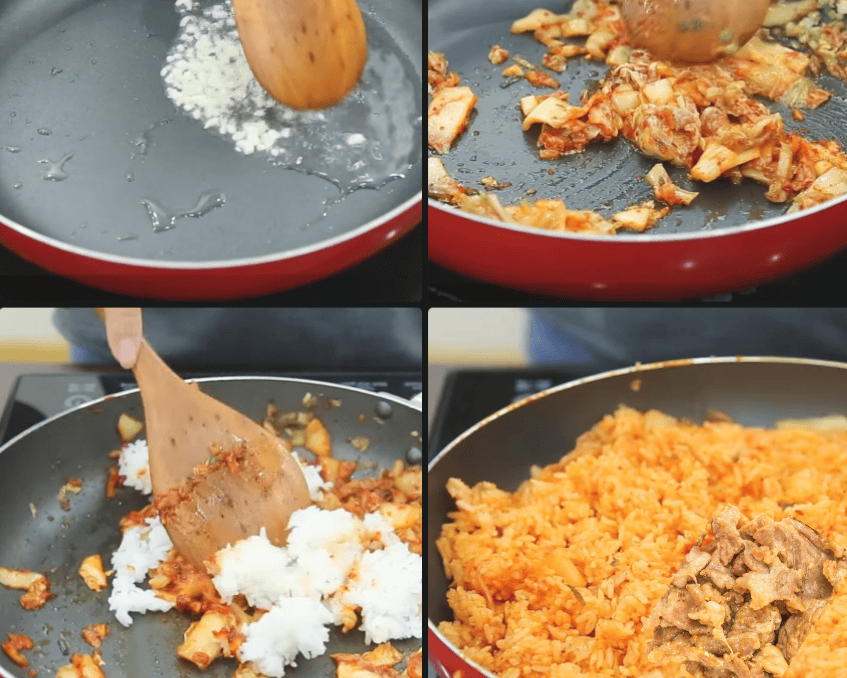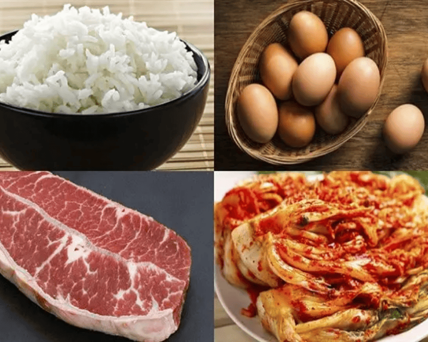 - Cách thức chế biến: Cơm nấu để nguội được chiên săn với trứng, sau đó xào cùng kim chi và ba chỉ bò cắt nhỏ.