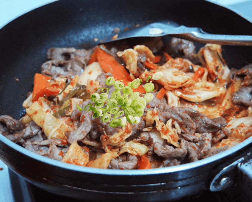 - Thêm kim chi vào đảo đều 2–3 phút cho hòa quyện.