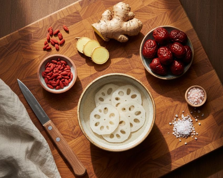 - Gia vị: Dùng gừng tươi giúp canh thơm, ấm bụng và cân bằng vị ngọt của táo đỏ. Đường phèn tạo vị ngọt thanh, làm nước canh trong và dịu hơn so với đường cát. Một nhúm muối hồng giúp làm nổi vị ngọt tự nhiên từ củ sen và táo đỏ.