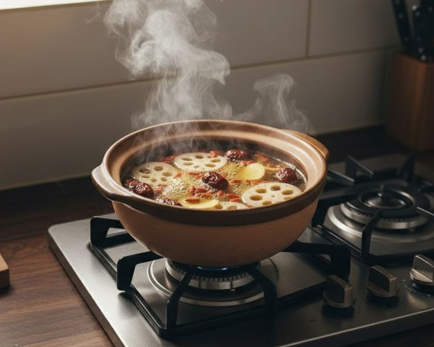 - Khi nước sôi, cho củ sen và táo đỏ vào, hạ nhỏ lửa, hầm liu riu khoảng 35–40 phút cho mềm.