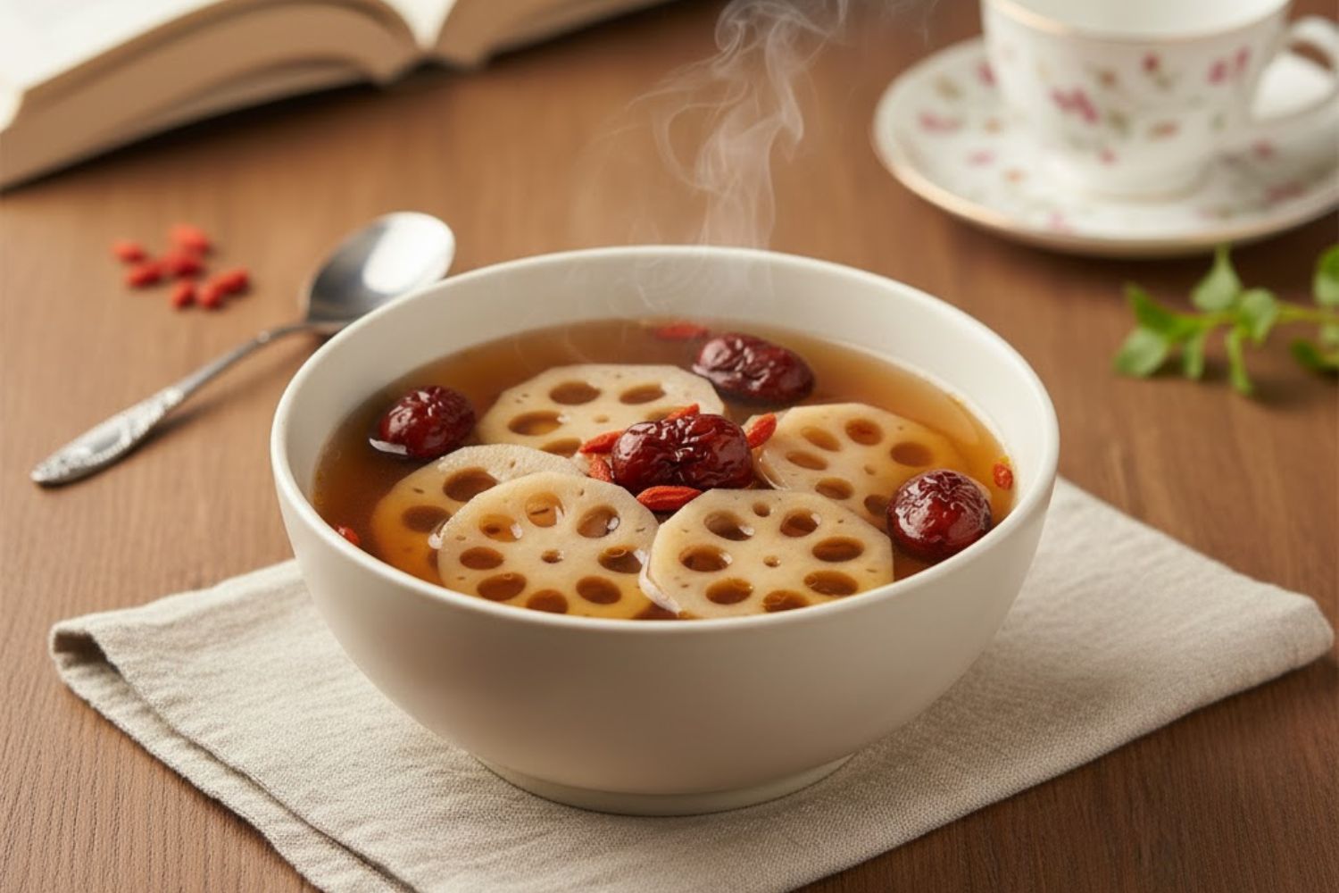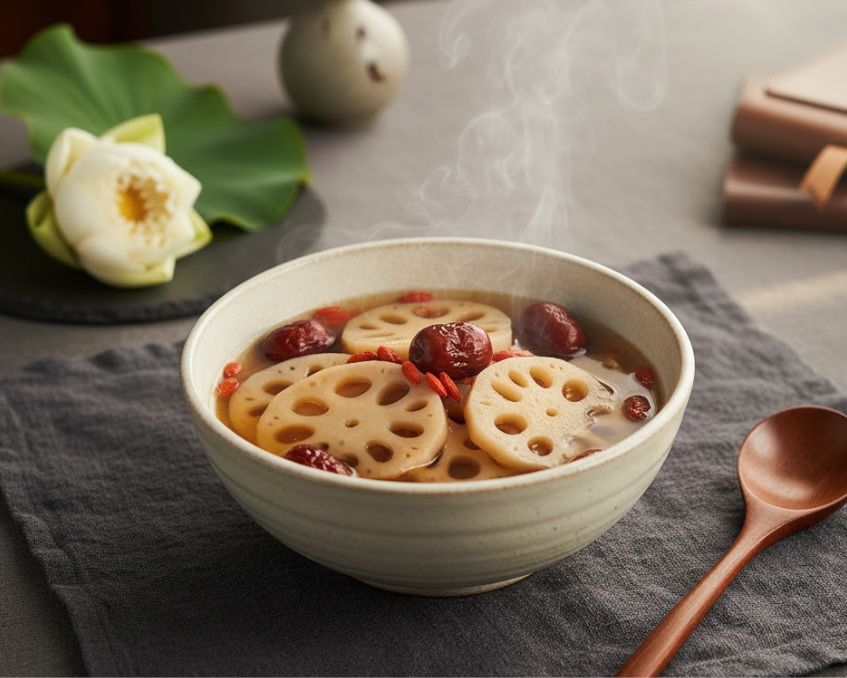 - Cách trình bày và thưởng thức: Múc canh ra tô sứ trắng, xếp vài lát củ sen và táo đỏ nổi trên mặt, có thể rắc thêm vài hạt kỷ tử trang trí. Dùng nóng hoặc ấm đều ngon và dễ tiêu hóa.