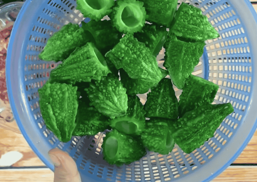 • Cắt đôi khổ qua, bỏ hạt và phần ruột trắng.