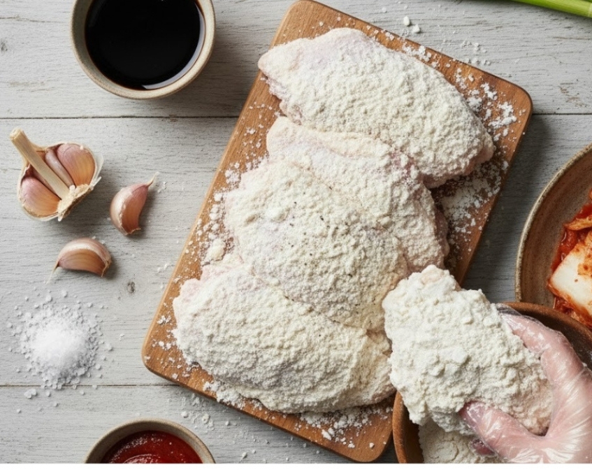 • Lăn bột: Lăn gà qua bột chiên giòn khô (hoặc hỗn hợp bột và chút nước lạnh) sao cho bột bám đều, tạo lớp vỏ mỏng. Để gà nghỉ 10 phút trước khi chiên.