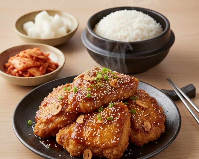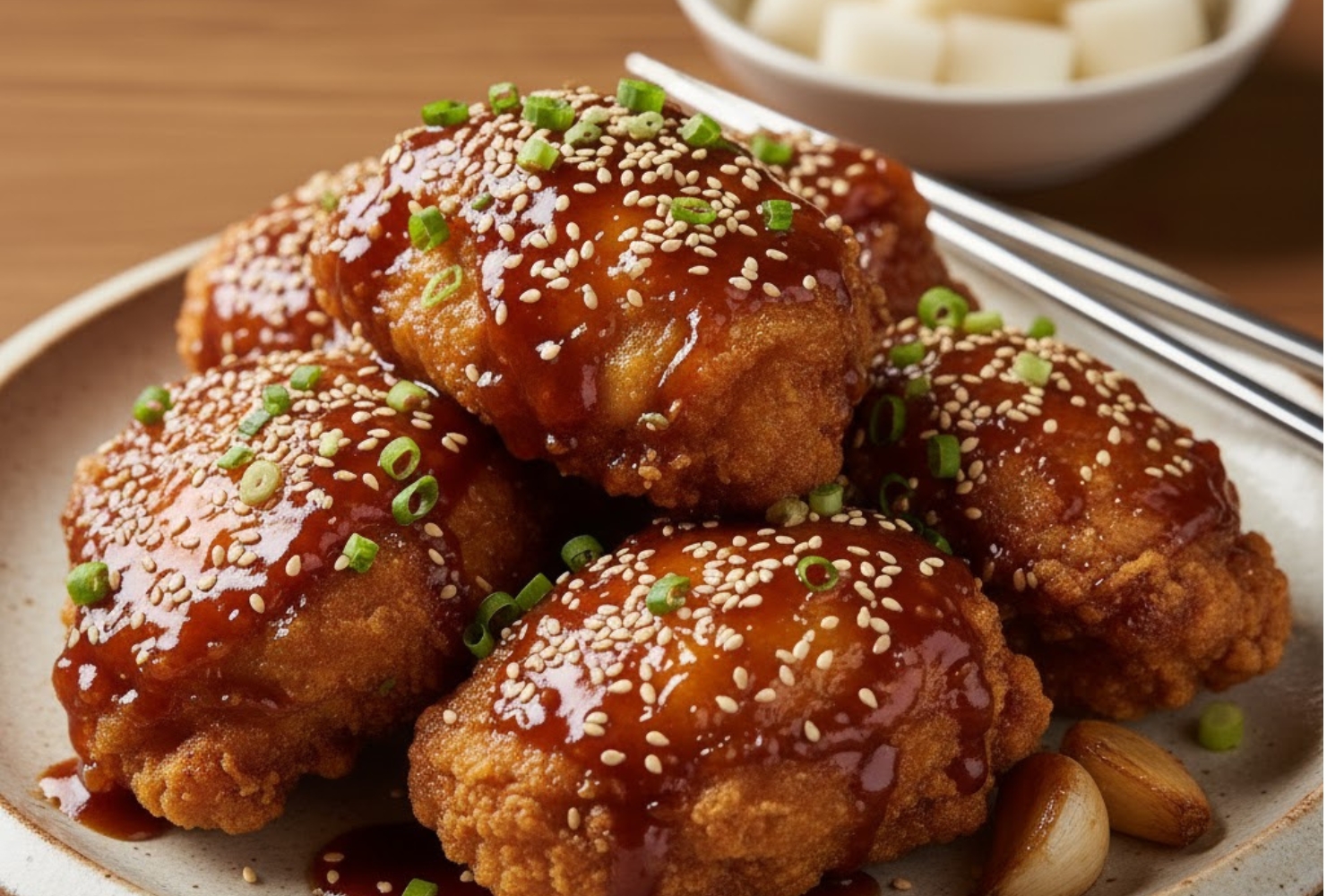 Gà chiên sốt tương tỏi là một trong những món ăn đường phố và ẩm thực gia đình nổi tiếng nhất của Hàn Quốc, đã nhanh chóng làm mưa, làm gió tại Việt Nam. Món ăn này là sự kết hợp hoàn hảo giữa lớp má đùi gà với lớp da được chiên giòn rụm bên ngoài và phần thịt mềm mọng nước bên trong, phủ bởi lớp sốt tương tỏi đậm đặc, ngọt mặn hài hòa.