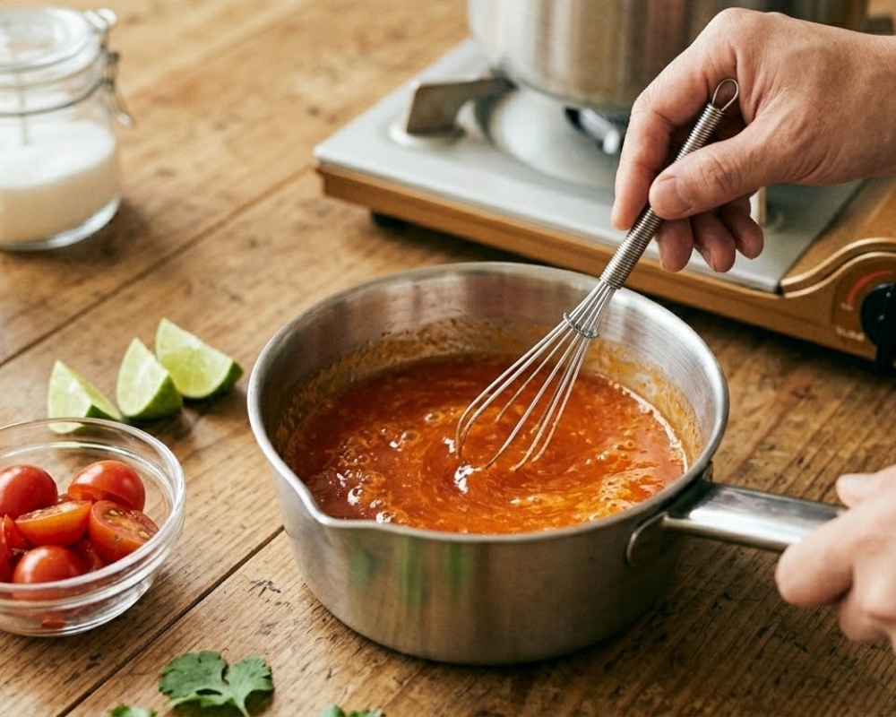 - Đun hỗn hợp sốt trên chảo nhỏ, lửa liu riu. Khuấy đều cho đến khi sốt sôi hơi sánh lại.