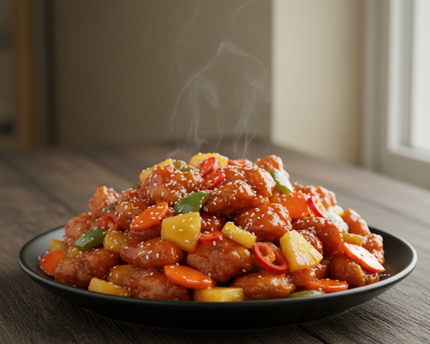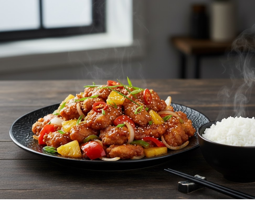 - Hương vị: Vị chua ngọt hài hòa, đậm đà của sốt, thơm mùi tỏi, gừng và ớt chuông. Thịt gà mềm mọng, không bị dai.