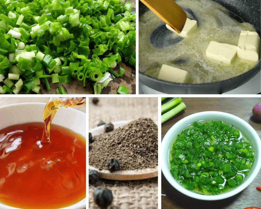 • Cho bơ lạt đã đun chảy vào chén hành lá, thêm chút dầu ăn và nước mắm, khuấy đều.