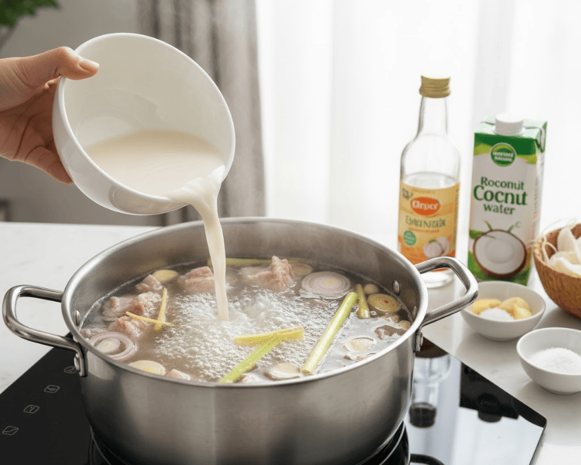 - Pha giấm với nước dừa tươi theo tỷ lệ khoảng 1:2, cho vào nồi nước dùng.