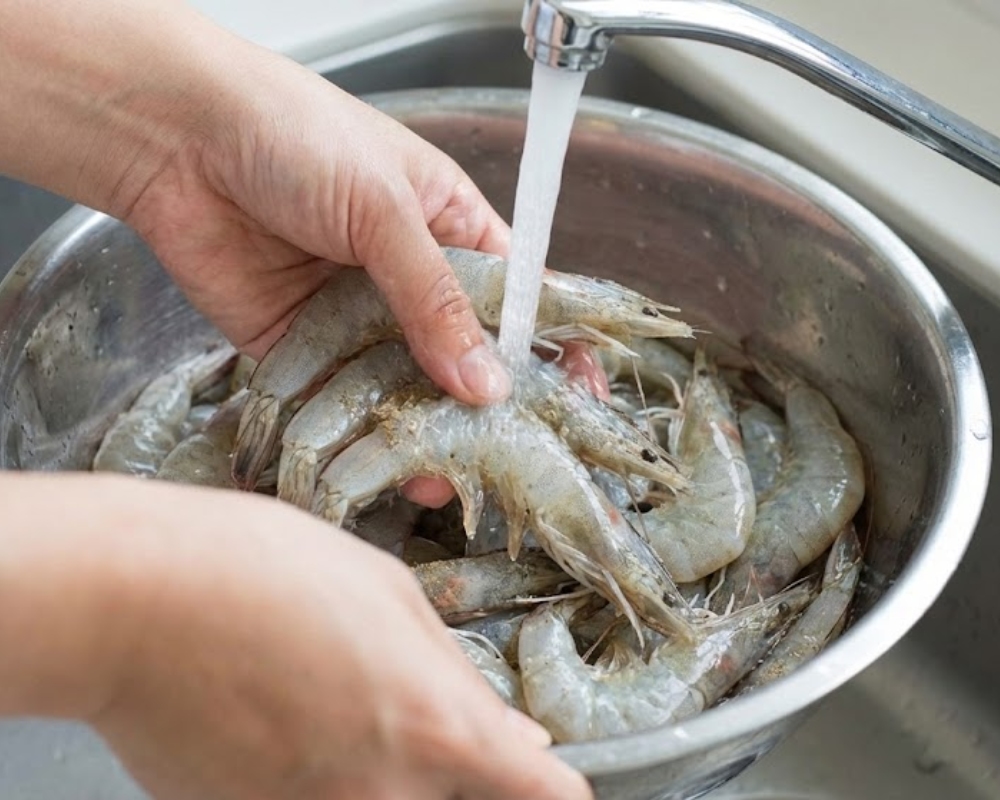 - Tôm rửa nhanh dưới vòi nước để loại bỏ cát bẩn, để ráo.