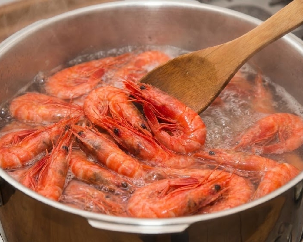 - Cho tôm vào khi nước đang sôi ở khoảng 100°C, đảo nhẹ.