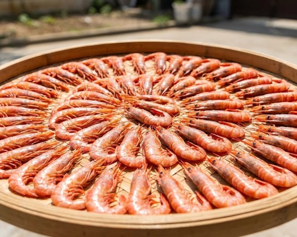 - Phơi nắng to 1–2 ngày đến khi tôm khô bề mặt, bên trong còn dẻo.