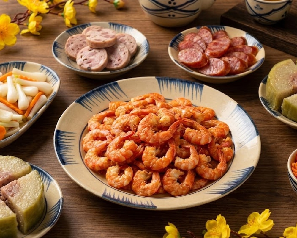 - Cách trình bày và thưởng thức: Tôm khô thường dùng làm nguyên liệu cho các món ngày Tết như củ kiệu, gỏi hoặc xôi. Khi bày ra đĩa, tôm có màu đỏ cam trong, thịt tôm ráo, không bám màu lạ, giúp món ăn thêm bắt mắt.