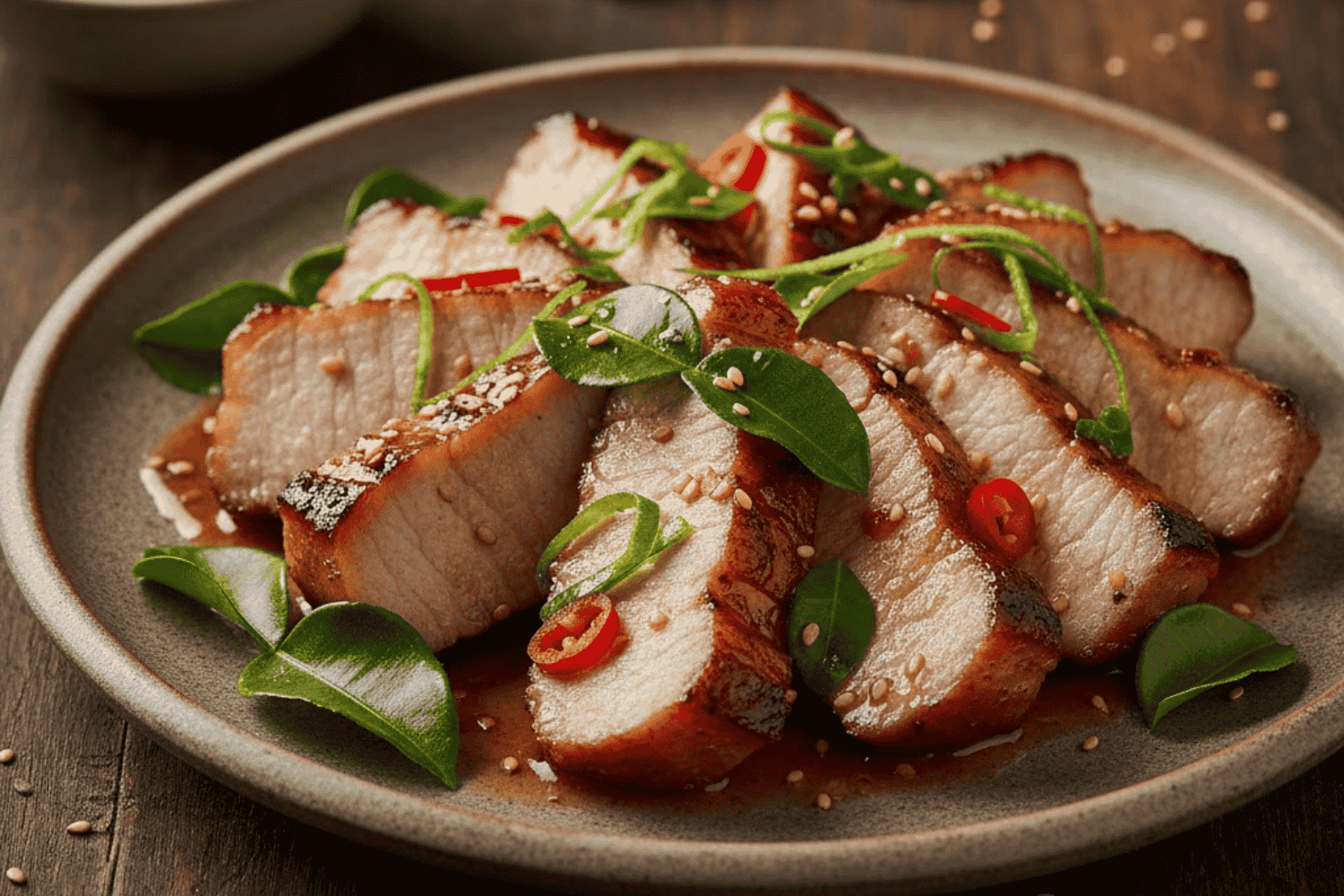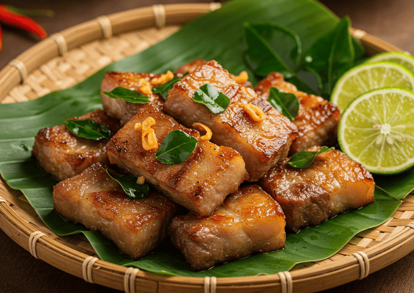 Nạc dăm nướng lá chanh, thịt mềm, cay nhẹ, thơm mùi lá chanh