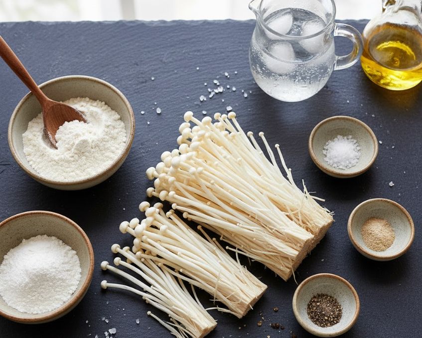 • Bột chiên: Kết hợp bột chiên giòn và bột bắp (tỷ lệ 3:1) giúp lớp vỏ giòn lâu và bám đều vào nấm. Thêm ít bột nở hoặc soda lạnh giúp lớp bột phồng đẹp khi chiên.