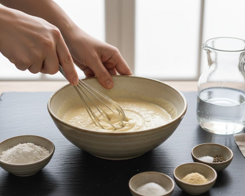 • Thêm từ từ nước lạnh (hoặc soda) vào khuấy đều đến khi hỗn hợp sánh mịn, không quá đặc.