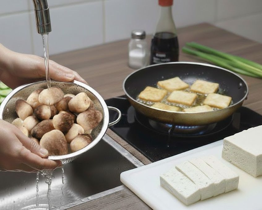 → Bước này giúp nấm giảm mùi hăng và hạn chế tiết nước khi kho – lỗi thường gặp khiến món kho bị loãng. - Đậu hũ cắt miếng vuông vừa ăn, chiên sơ các mặt đến khi vàng nhẹ, vớt ra để ráo dầu.