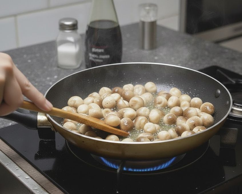 → Không nêm gia vị ở bước này để tránh nấm ra nước.