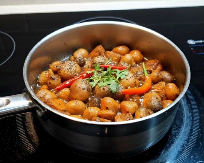 - Hạ lửa nhỏ, kho 10–15 phút cho món ăn thấm đều, nước kho sánh nhẹ.