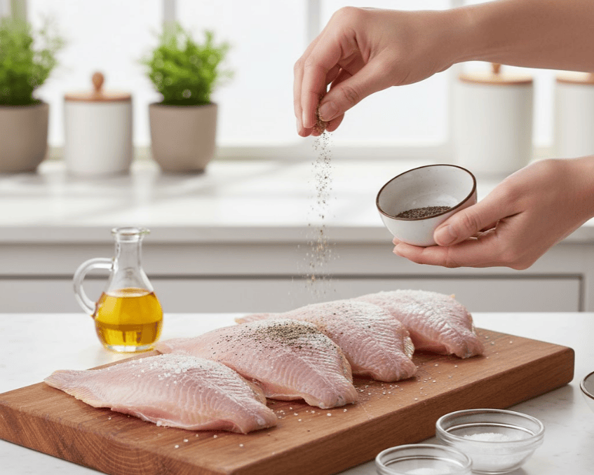 - Ướp cá với chút muối, tiêu, bột ngọt trong 10 phút.