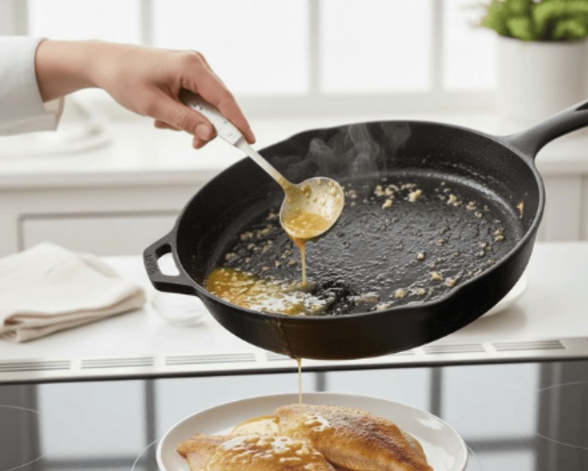- Tắt bếp, đổ hỗn hợp bơ tỏi lên cá đã chiên.