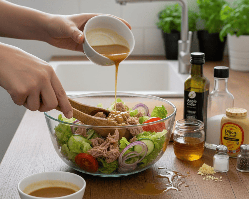 • Cho cá ngừ, rau củ vào tô lớn, rưới nước sốt vào, trộn đều.